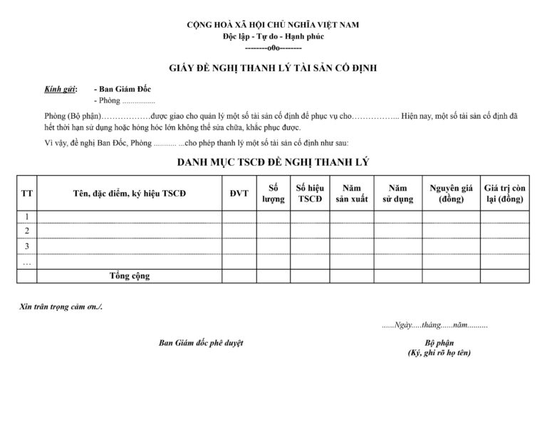 Sau khi kiểm kê tài sản, dựa trên các biên bản kiểm kê cũng như quá trình theo dõi TSCĐ tại doanh nghiệp, bộ phận có nhu cầu thanh lý TSCĐ sẽ làm giấy đề nghị này để trình lên lấy phê duyệt từ ban giám đốc. Trong đơn đề nghị thanh lý cần có danh mục TSCĐ đề nghị thanh lý