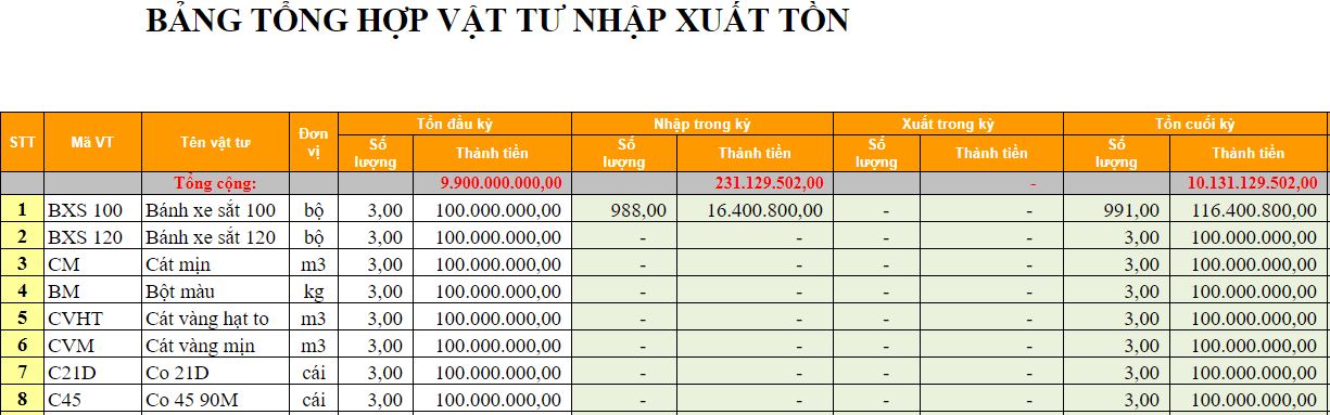 - Bảng tổng hợp nhập – xuất – tồn: Tên hàng hóa, mã hàng hóa, dư đầu kỳ, đơn vị tính, xuất nhập trong kỳ, tồn cuối kỳ.